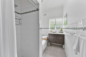• Tidy bathroom with crisp white tiles, separate bath/shower and toilet